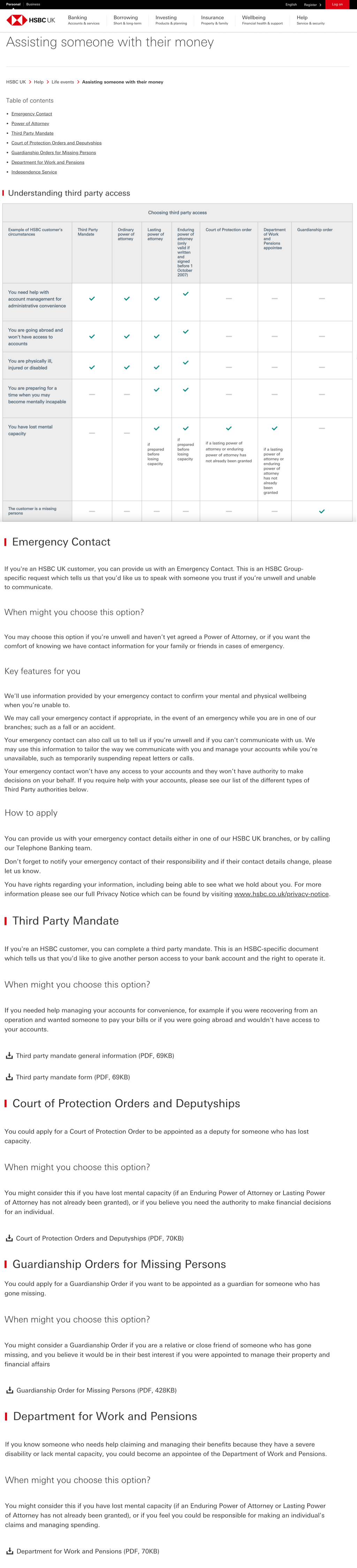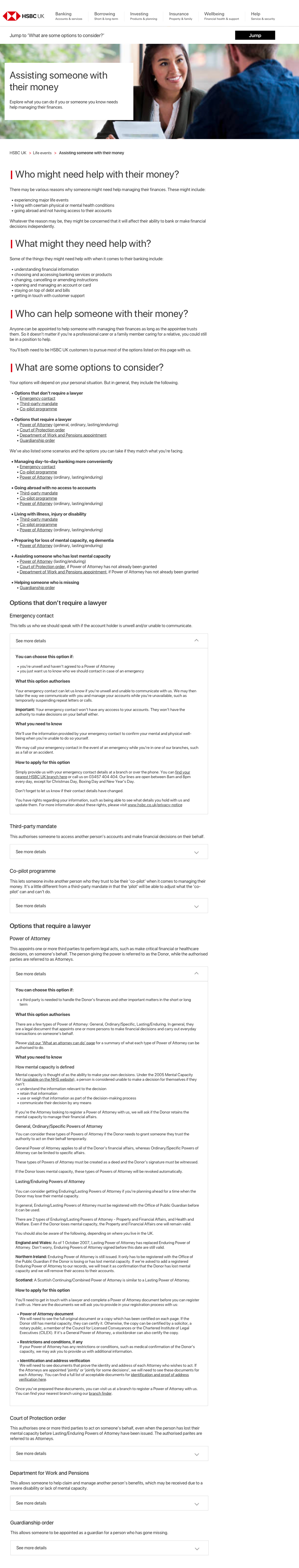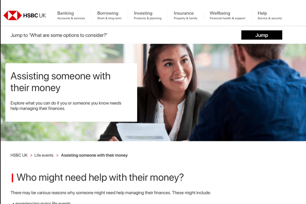 Identify areas to improve upon for the existing ‘Assisting someone with their money’ page on the HSBC UK website.